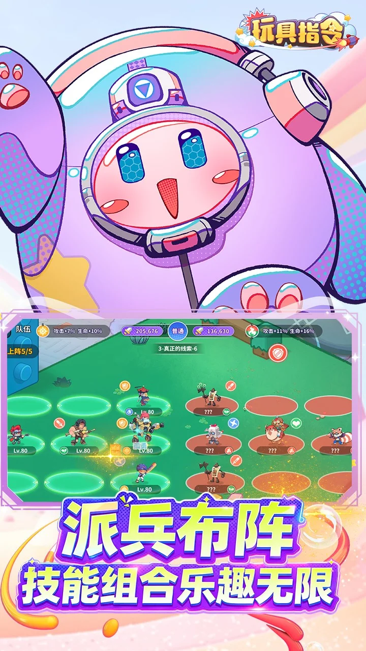 游戏融合了放置策略和割草战斗的趣味玩法。游戏中主角因实验意外缩小到只有手办大小,随后结识了许多玩具伙伴,并组建了属于自己的冒险团,从而踏上了寻找恢复身体大小的道路。游戏中玩具伙伴共有五大阵营和五种职业,各个阵容和职业之间相辅相成,组合成强大的冒险团,从而揭开玩具世界的神秘面纱!游戏玩法轻松休闲,轻松体验策略搭配和割草战斗的乐趣。