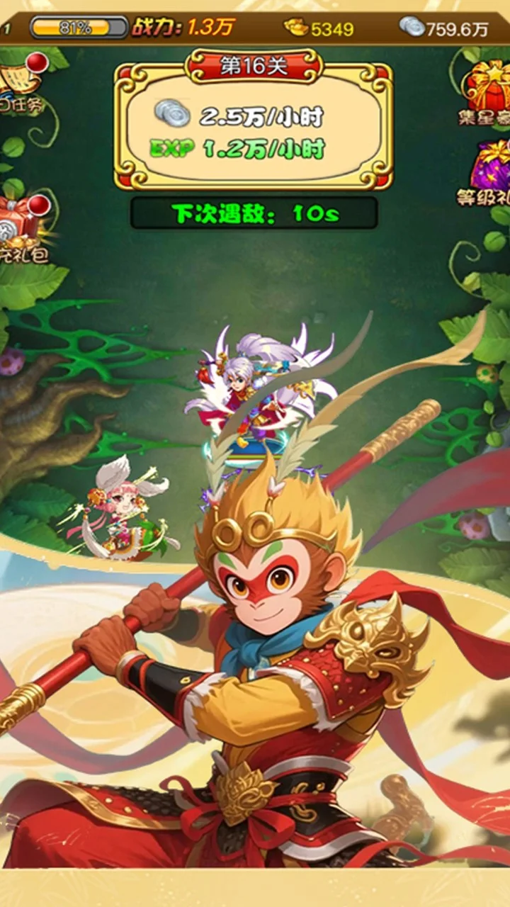 游戏模式丰富多样,让玩家踏上一条全新的西行征途,感受神仙们各具特色的神奇本领。通过不同的技能组合,创造出千变万化的战斗风格, 塑造出专属于自己的独特仙灵形象。游戏突破了传统挂机类游戏玩法单一的局限,融入了多种新颖玩法和多元战斗模式。还可以解锁种族间的羁绊关系,收集众多精美卡牌,与 伙伴们一同开启一段奇幻的西游冒险之旅。