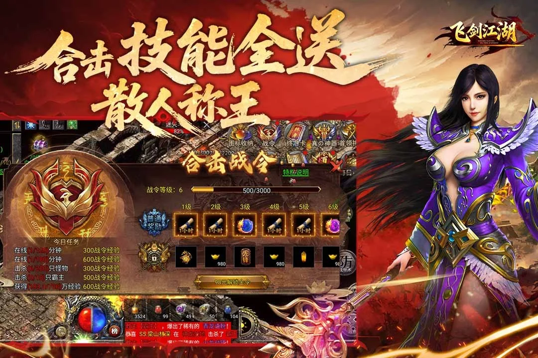 《飞剑江湖》是经典复古传奇手游,主打三职业打金,支持千 人同屏激战。继承端游核心玩法,优化系统兼顾新老玩家,有 随机装备掉落、特色合击技能等亮点,还能自由交易、稳定搬 砖。细腻画面还原魔法大陆,写实场景搭配炫技特效,刷怪、 PK、攻城体验酣畅,长周期版本物价稳、保值强,休闲或深 度玩家都能找到乐趣。