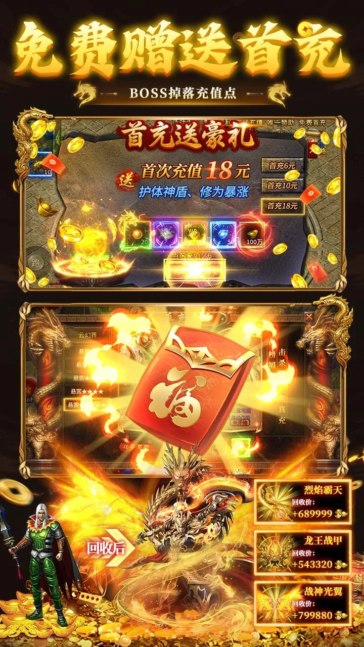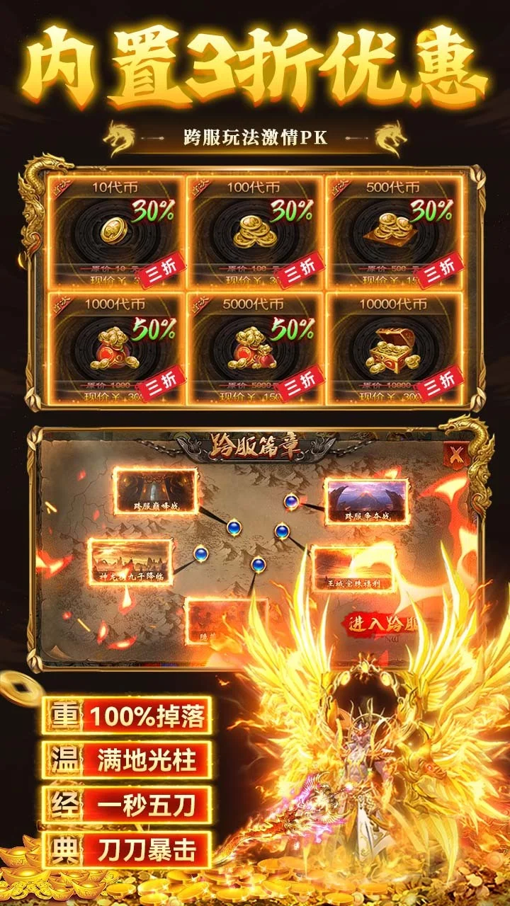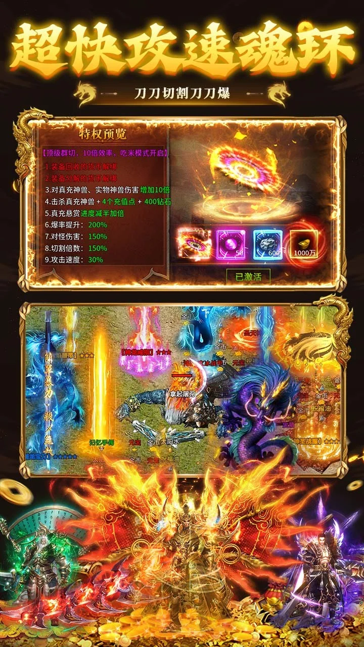 一款攻速题材的传奇游戏,内置三折充值系统,游戏特色是上线就送满级攻速,刀刀切割、还有多种神通玩法供你选择;登录送328代币,创角送即送切割/盾牌/斗笠神器,免费首充,免费VIP,打怪掉落实物道具可兑换充值点直接充值钻石和获取累充记录,传奇玩法自由度高,福利满满;线上更有超多不同的活动玩法供你获取资源;白嫖也能变大佬。
