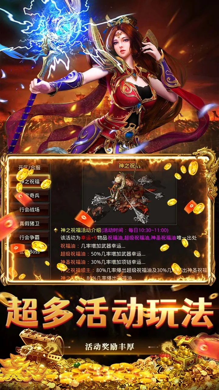 一款多职业1.80复古微变小数值的传奇游戏,内置三折充值系统,上线就送大地命格,登录送648红包,完成成就奖励获取大量贵族积分免费抽奖升级贵族,多职业版本,可选法师/战士/道士,游戏内更有行会建设沙城争霸等各种玩法,本服活动丰富,奖励丰厚;遇到活动也不要错过;白嫖也能变大佬!!