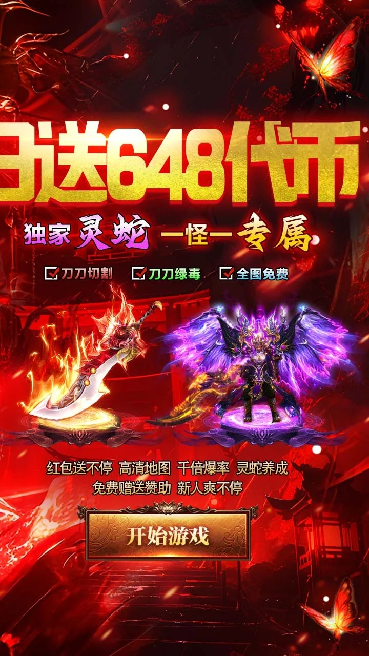 游戏内置3折充值福利,开局送超级灵蛇成长神器,范围拾取、刀刀绿毒、新人称号爆率+30%,切割+8888、打野神剑、天天648代币,每天在线领充值红包,各种红包和道具拿到手软,一怪一专属,每个怪都会爆出对应的专属装备,BOSS光柱爆满屏,新版神器等你来战!