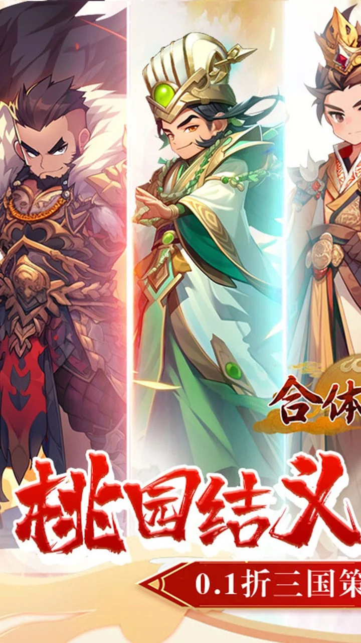 汉室衰微,豪杰蜂起,无名之人阴差阳错之间,竟穿越三国时代?他却不知,未来将因此改变,一位旷世奇才即将世出... 三国策略卡牌《合体三国》0.1折火热上线,全场尽享0.1折充值福利!进游创角就送开荒利器神吕布,直升贵族6!每日更有活跃任务赠送充值卡,每日刷新无限领取!升级再领万元充值卡,免费获得大量元宝并激活累充进度!游戏将以穿越者的视角出发,以清新的国漫风格诠释了恢弘的三国时代。点将台上群英荟萃,各路豪杰助你南征北战。无论是破阵勇士还是治国谋臣,都有自己独特的战术价值,合理的搭配正是制胜关键所在。匡扶正道,就在今朝,全新的三国传奇故事,敬请见证