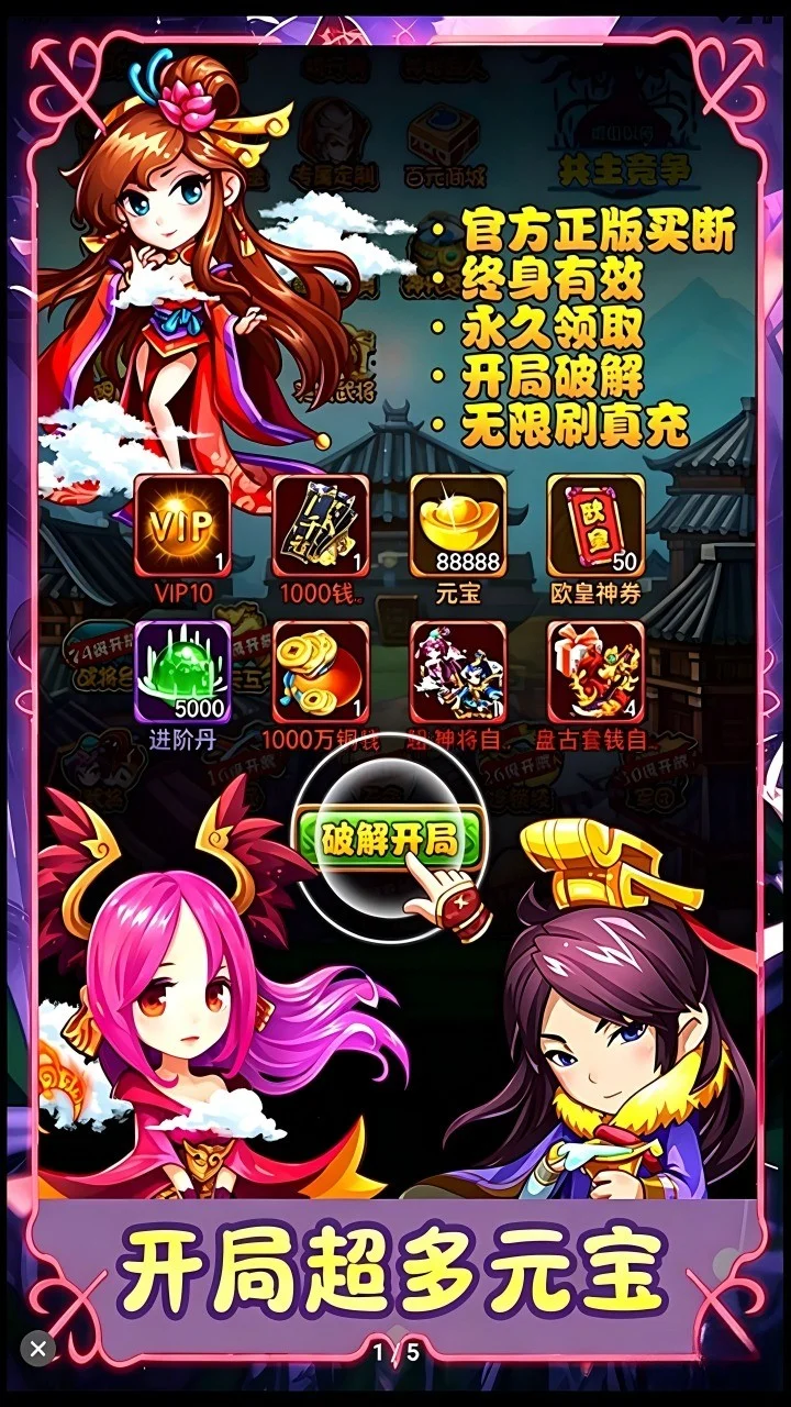 这款以三国为背景的卡牌放置手游,以恢弘的三国乱世为舞台,还原了从桃园结义到三分天下的经典名场面,用细腻的画质将三国英雄的豪情与风骨展现得淋漓尽致,让你一秒穿越千年,置身群雄逐鹿的热血时代。在这里,你将化身乱世主公,遍历三国疆土,收集各路传奇名将——无论是忠肝义胆的关羽、足智多谋的诸葛亮,还是雄才大略的曹操、英姿飒爽的赵云,数百位武将各有专属技能与羁绊,属性克制、阵营搭配暗藏策略玄机。游戏巧妙融合了卡牌与挂机玩法,丰富多样的PVE和PVP内容让你沉浸其中。你可以自由培养武将,升级、突破、觉醒、炼神,解锁专属皮肤与隐藏战力,打造属于自己的王牌阵容,无论是攻防兼备的稳健组合,还是爆发拉满的秒杀阵容,都能随心搭配,用谋略碾压对手,享受运筹帷幄的快感。 游戏打破传统卡牌的繁琐操作,巧妙融合卡牌养成与挂机放置玩法,让你轻松护肝不费力。离线状态下,武将依旧能自动征战、收集资源,上线即可领取丰厚收益,无需花费大量时间肝度,既能体验养成的乐趣,又不耽误日常工作与生活,真正实现“躺赢”乱世,轻松称霸。更有超值福利全程护航,让你轻松开启三国征程! 乱世已至,英雄集结!召集你的三国名将,搭配最强阵容,在烽火连天的乱世中崭露头角,平定四方战乱,收服各路诸侯,最终登顶乱世之巅,成为一代传奇霸主!现在下载,开启属于你的三国风云之旅,书写属于你的乱世传奇!