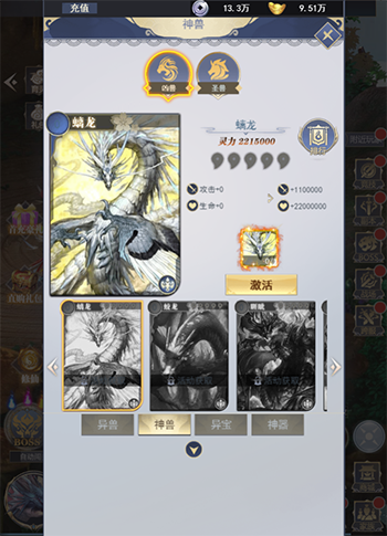 而比异兽更加高级的是神兽,一旦玩家拥有一只神兽助里,那么战力就会急剧飙升。