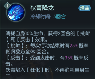 【狄青】是复活流中较为全面平均的武将,即便没有触发复活后的【狂化】效果,【狄青】也可凭借技能【狄青降龙】获得无法驱散的【反击】和【挑衅】效果,兼顾控制与输出的能力。