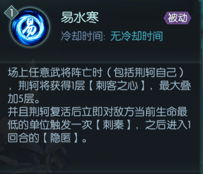 【荆轲】复活流中的核心输出武将,叠满5层【刺客之心】之后的【荆轲】,应该是目前版本中输出最高的刺客型武将了。高输出与强生存总是难以兼顾,虽然【荆轲】的伤害爆表,但面板中的生命与防御成长资质却不尽如人意。