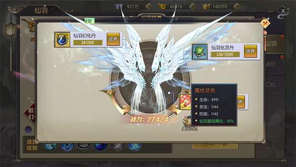 5. 仙羽培养可以增加生命,攻击,和防御属性。主要是通过喂养仙羽幻化丹和仙羽化灵丹来提升。
