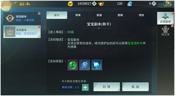 副本入口:界面上“副本”或者“日常”,选择“宝宝”副本
