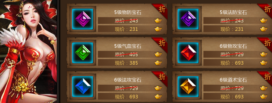 元宝商城出售所有的4、5、6级宝石,绑定元宝商城出售所有的1级宝石,您可以根据需求进行购买。