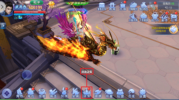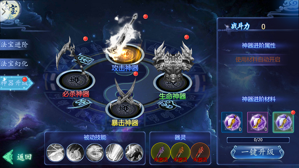 如上图所示,神器系统在玩家达到120级时开启的,在主界面点击法宝图标再点击神器升级即可进入神器系统界面。