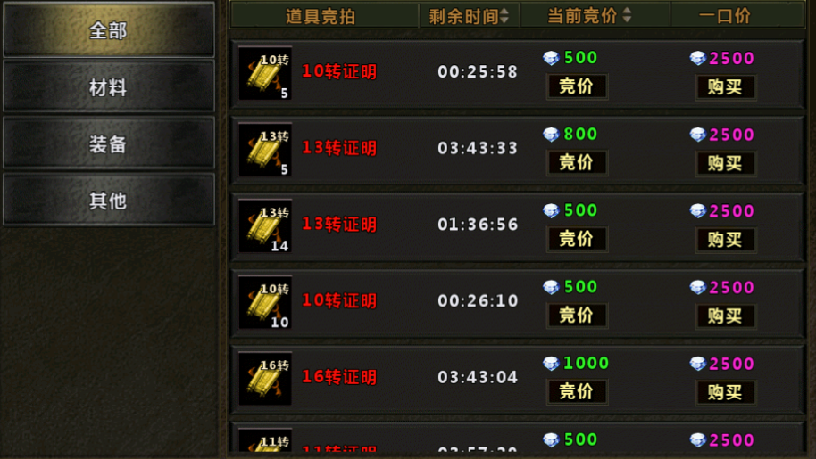 ★拍卖行介绍:拍卖行中可以购买和出售转生证明,装备,时装等稀有道具。玩家可以点击上架查看背包中可以出售的道具。上架前可以选择竞标价和一口价。上架时间为4个小时,可以在记录中查看购买记录和卖出记录。道具卖出后的钻石或者流拍后的道具可以在邮件中查收。玩家可以在世界中查看是否有自身需要的道具进行竞拍或者直接买下。玩家在拍卖行中的交易税率为10%。(拍卖行中消费仅支持充值钻石交易,不计入消费活动)