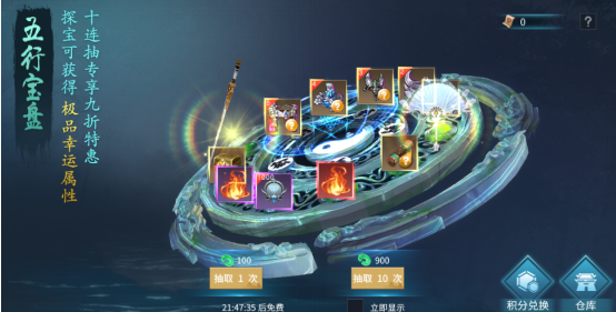 在五行宝盘中可以进行探宝抽取装备,有机会获得极品幸运属性的装备,每次探宝还可以获得10积分,积分用于兑换装备或道具,但使用免费探宝或者宝盘卡进行探宝无法获得积分。