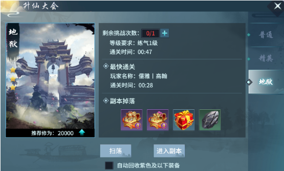 进入【日常】-【副本】,可以进行游戏挑战,通关后副本会掉落对应装备,还有魔核、礼包等掉落。其中包含10个阶段的副本,每个副本掉落的是从“炼气”到“仙变”10个转生阶段对应的装备。如【升仙大会】掉落的是“炼气”的紫色装备,【宗门拜师】掉落的是“筑基”的紫色装备。