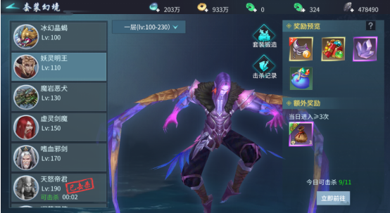 进入【斩仙】-【试炼妖塔】,可以挑战各个等级的Boss,通关后副本会掉落对应装备,还有离线经验药和进阶材料礼包等物资掉落。其中包含了多个Boss供挑战,每个Boss掉落的是从“炼气”到“仙变”10个转生阶段对应的装备。每转生一次就后开启后续等级的Boss。