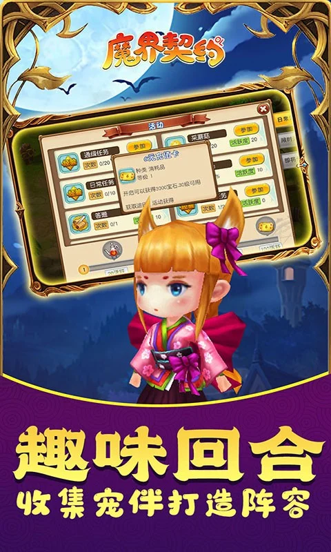 《魔界契约-送千元充值》是一款梦幻次元风RPG冒险战斗类手游,充分继承经典MMORPG人物培养、宠物育成、伙伴羁绊等的特点。游戏画面采用的是3D的Q版风格,让玩家明显感受到3D技术带来的新鲜体验。游戏采用unity3D游戏引擎,人物角色则采用全3D模型技术,使得人物形象更加鲜活生动,令众多鲜明的人物在游戏中变得栩栩如生。同时,采用3D摄像技术,让所有战斗的画面表现均达到极致水平,玩家能无时无刻体验到3D游戏的魅力所在。在地图设计上,尤为注重色彩的搭配,相信精美的画面会给玩家带来不一样的视觉体验。