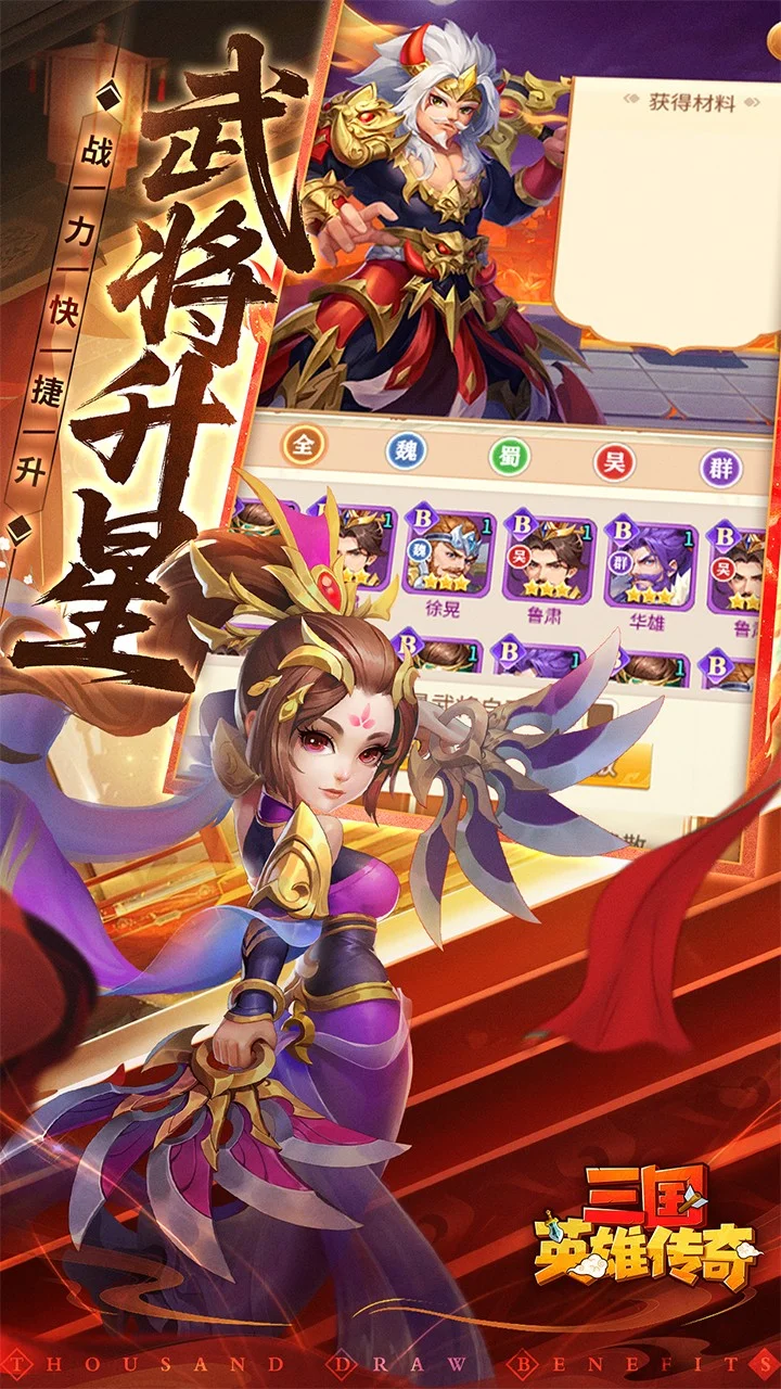 《三国英雄传奇》以恢弘三国乱世为舞台,打造沉浸式策略征战体验。在这里,你可化身一方诸侯,于赤壁烽烟中运筹帷幄,在官渡古战场上挥师破阵,招揽关张赵马黄等名 将,组建专属传奇阵容。从黄巾起义到三分天下,从单骑闯关到军团争霸,每一步抉择都可能改写历史走向。沉浸式剧情还原经典战役,策略搭配解锁百变阵容,更有多重福利 助你快速崛起,开启属于你的三国传奇之路。