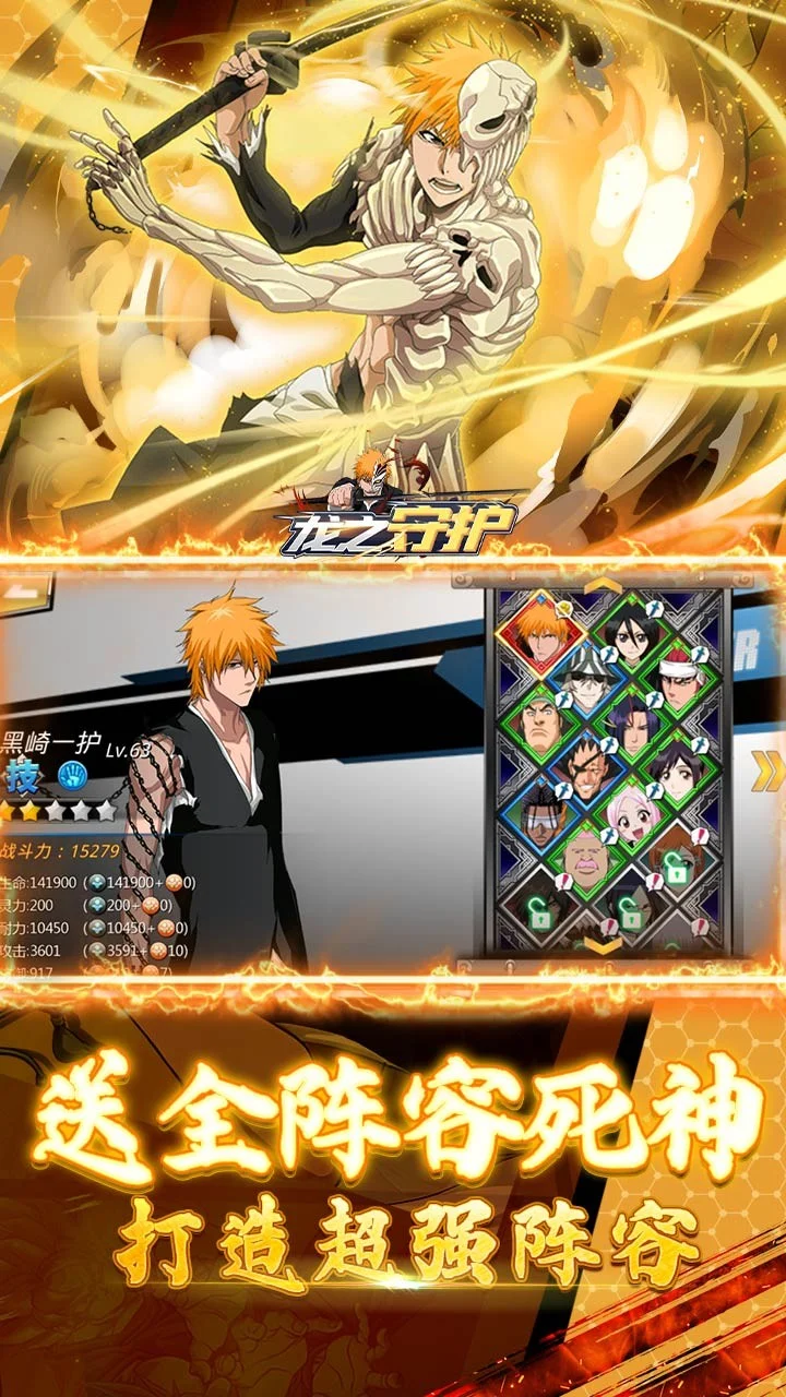 龙之守护以经典漫画作品《死神》原著剧情为游戏背景的卡牌格斗类游戏,送全阵容死神,每日再送648代金券,全场充值0.5折,福利应有尽有,十年经典永不完结在此带领玩家们感受死神世界的热血经典,极度真实还原动漫人物战斗表现,超华丽的招式攻击享受最真实的打击画面,拥有丰富的玩法元素、不肝不氪的游戏特点以及精彩刺激的战斗场景,全方位的为你提供作为独到的游戏体验。