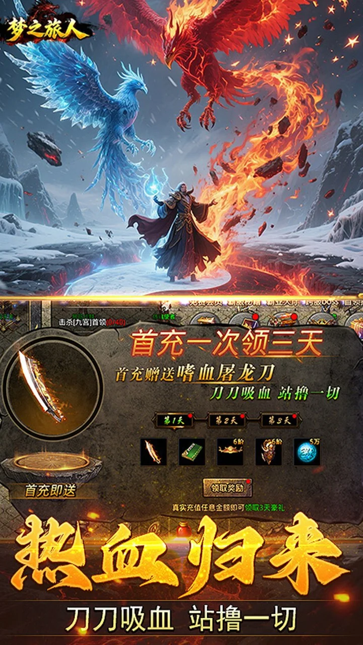 《梦之旅人》是一款复古三职传奇游戏,作为终身福利版本,回收装备即可活动真实模拟充值,最高可得3960元充值红包,来了就有,红包可激活累计充值活动,实现满级攻速