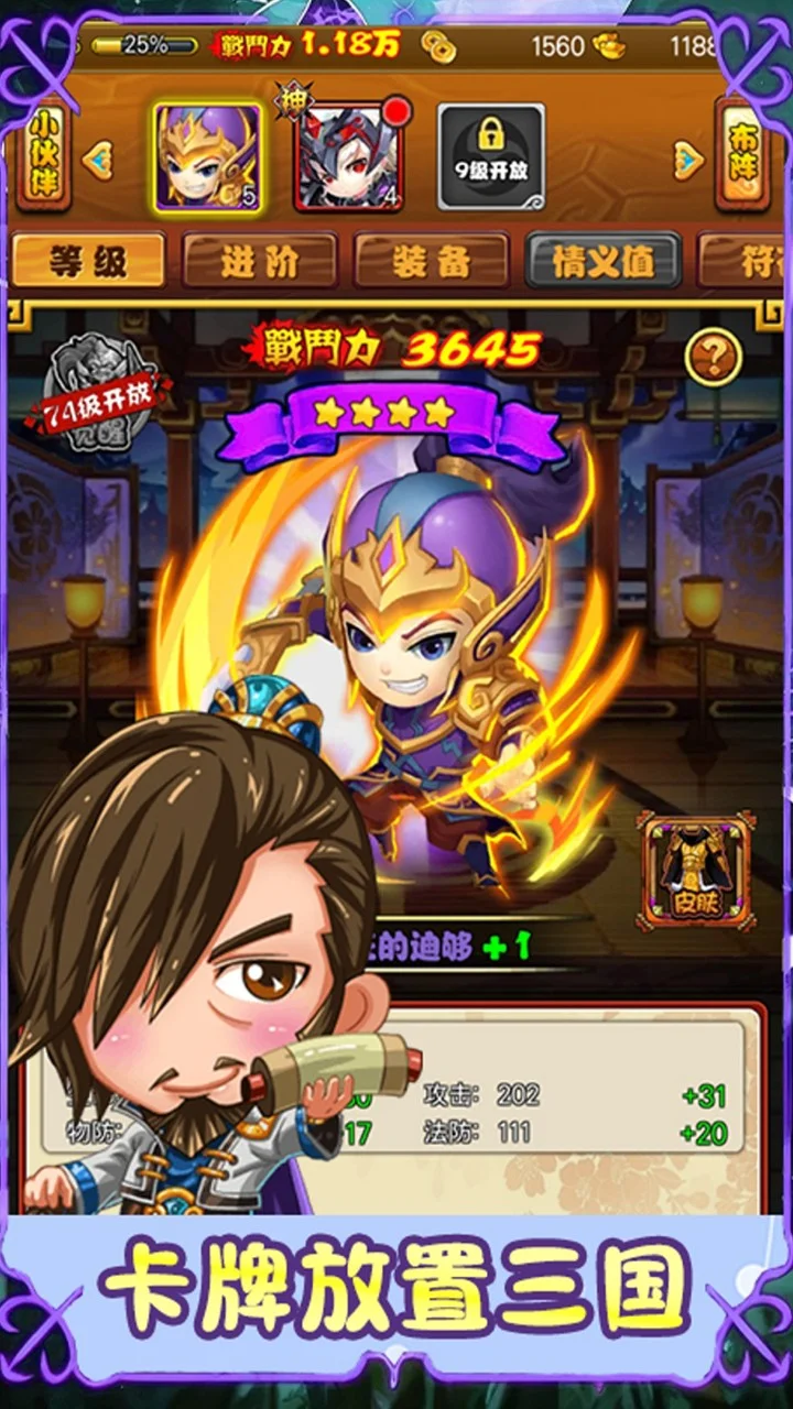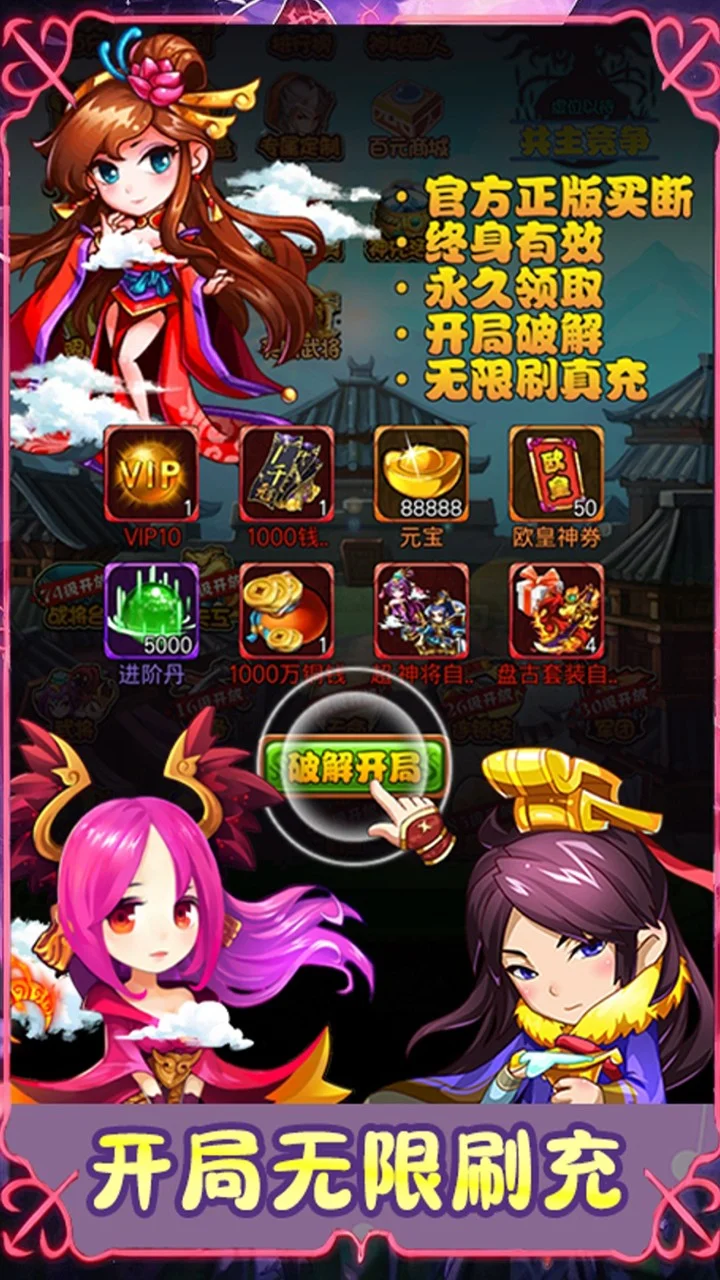以收集并培养各路名将,策略性地搭配阵容,享受酣畅淋漓的战斗体验。游戏巧妙融合了卡牌与挂机玩法,丰富 多样的PVE和PVP内容让你沉浸其中。更有超值福利等你来拿,让你尽情享受游戏的乐趣!此外,游戏还提供了多种活动和任务,让你的每一次冒险都充满惊喜和挑战。快来体 验这场三国风云之旅,成为一代霸主!