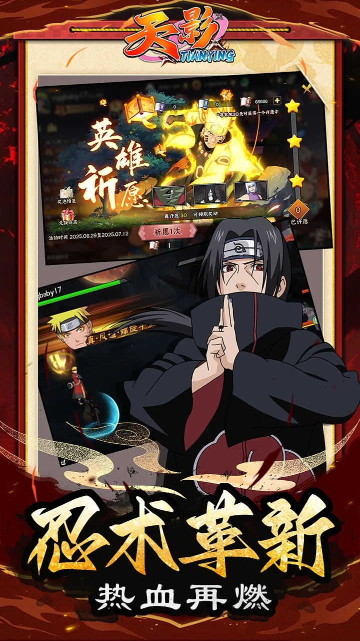 天影(0.1折影级之战)——火影忍者横版卡牌策略手游!以木叶烽火为卷,以忍术博弈为刃,斩破传统卡牌桎梏! 游戏深度还原原作经典剧情脉络,从木叶村的日常修炼到忍界大战的巅峰对决,每一帧画面都承载着火影迷的热血回忆。玩家可自由组合角色卡牌阵容,释放千鸟、螺旋丸等标志性技能,再现忍者对决的酣畅淋漓。0.1折超值福利加持,助力玩家轻松招募强力忍者,用智慧与热血碾碎一切强敌,在忍界之巅刻下属于你的传奇之名。
