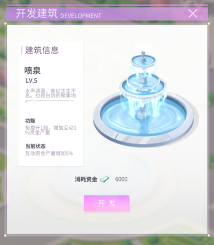 在“馆外”玩法中,我们可以自由建造升级公馆内的便民设施,如:超市、凉亭、健身设施、喷泉等设施。同时,在不断的建造与升级过程中,我们还可以通过建设并升级公馆设施,获得更多的游戏资金等道具。